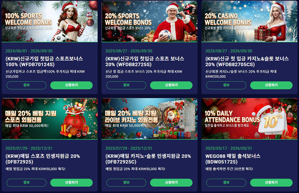 신규 사용자는 위고88에서 최대 20만 원의 입금 보너스를 받을 수 있습니다. 보너스 금액에 대한 롤링은 7배이며, 스보벳을 포함한 모든 제품 이용자에게 혜택이 제공됩니다.